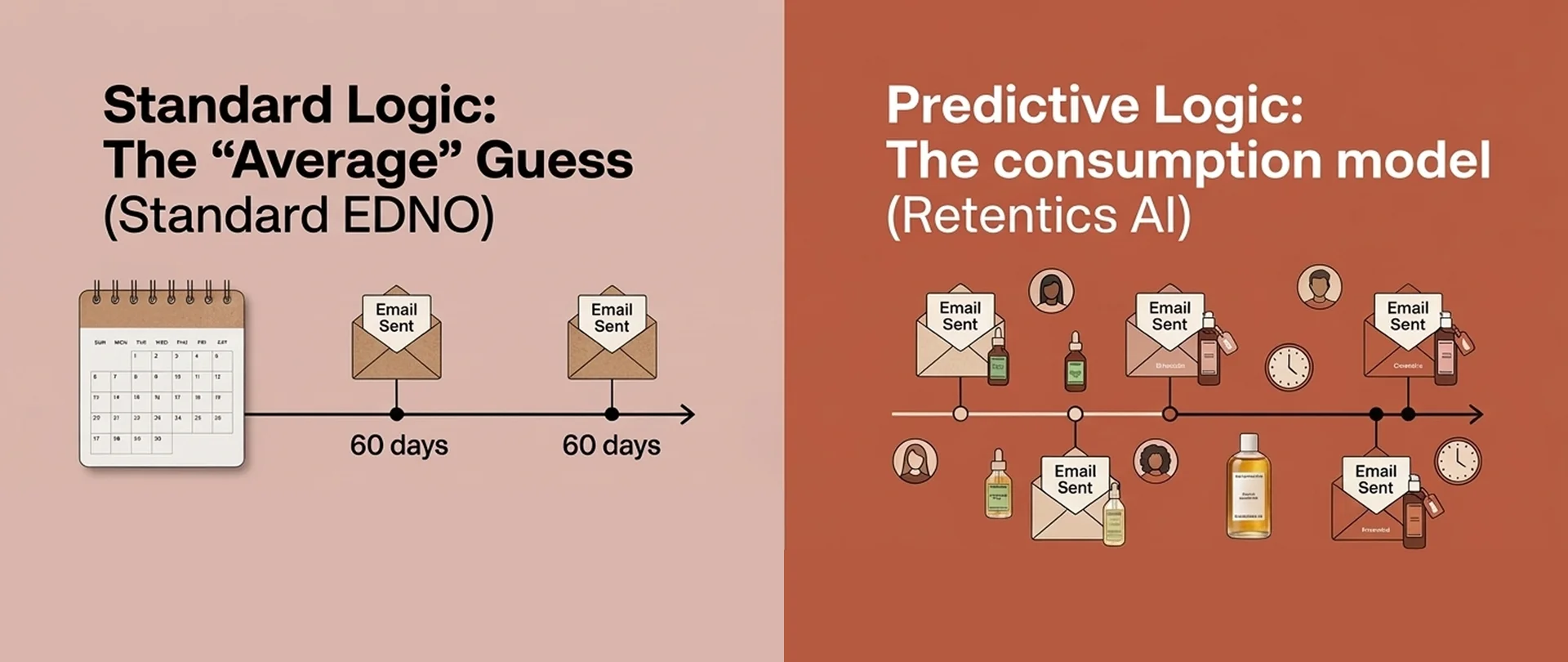 Most brands are forced to choose between two flawed options: manually setting static “averages” — like sending a reorder email every 30 or 60 days — or relying on Klaviyo’s standard Expected Date of Next Order (EDNO) trigger, which calculates timing based on broad historical data.