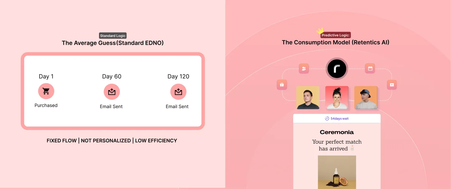 Logic over Averages: Instead of Klaviyo’s standard EDNO model, which relies on broad historical averages, we implemented an AI model that predicts consumption on a per-customer, per-product basis across these 7 segments.